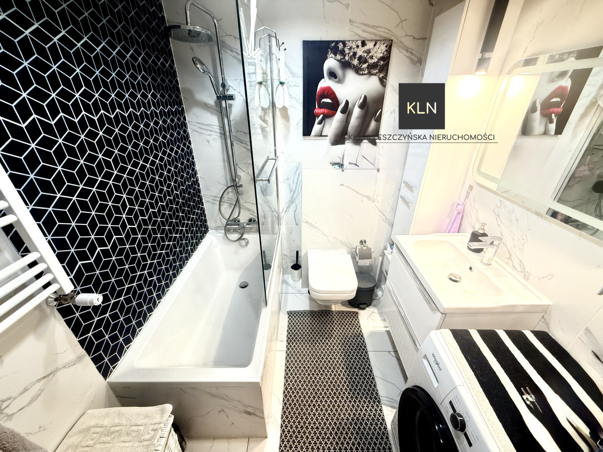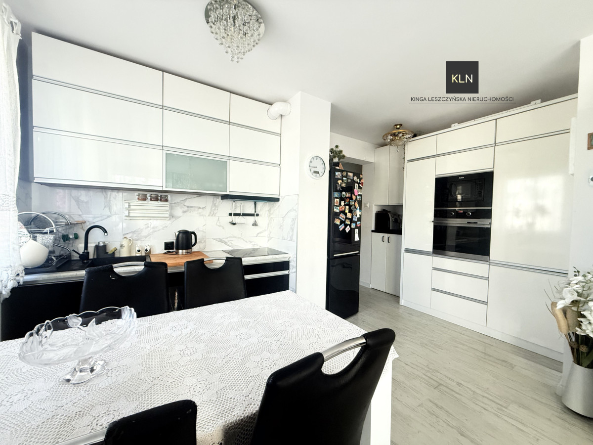W kuchni, w zabudowie meblowej, znajduje się lodówka, zmywarka, piekarnik oraz płyta indukcyjna. Na wyposażeniu pozostaje również pralka.