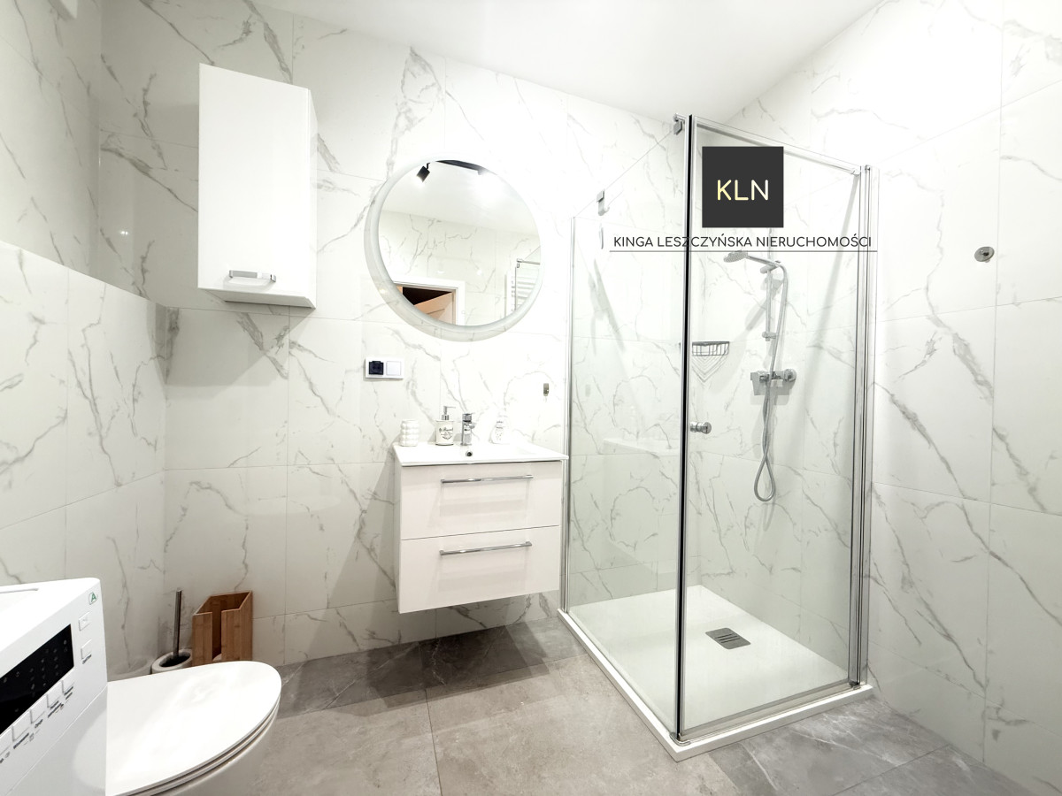 Nieruchomość jest w pełni wyposażona, w kuchni sprzęt AGD tj. zmywarka, płyta indukcyjna, piekarnik, lodówka a w łazience pralka.