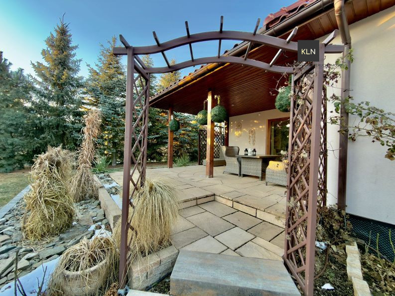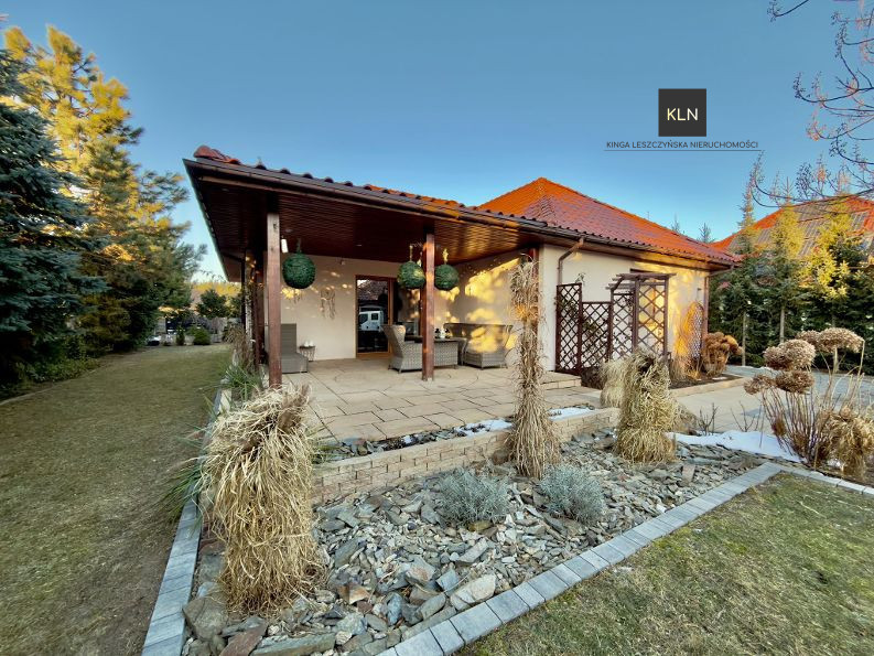 Budynek mieszkalny jest umiejscowiony na ogrodzonej działce o powierzchni 1000 m2, która jest przepięknym ogrodem z licznymi nasadzeniami z roślin ozdobnych oraz efektownych roślin formowanych. Ogród został nowocześnie zagospodarowany oraz wyposażony w zbiornik na deszczówkę i bezobsługowe podlewanie kropelkowe. W ogrodzie dodatkowym miejscem do wypoczynku na świeżym powietrzu jest zadaszony taras o powierzchni 40 m2.