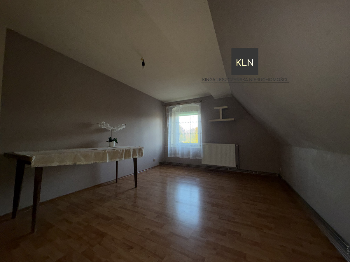 Dom usytuowany jest w cichej i spokojnej okolicy. Budynek wolnostojący z użytkowym poddaszem składa się z dwóch samodzielnych mieszkań: pierwsze obejmuje część parteru i całe poddasze użytkowe, drugie obejmuje część parteru do których prowadzą oddzielne wejścia z zewnątrz. W domu znajdują się trzy pomieszczenia przeznaczone na kuchnię oraz trzy łazienki z toaletą co pozwala na komfortowe użytkowanie domu w przyszłości. Pomieszczenia wewnątrz nadają się do zamieszkania po odświeżeniu lub do generalnego remontu. W ostatnim czasie budynek przeszedł gruntowny remont pokrycia dachowego z wykorzystaniem dachówki ceramicznej.