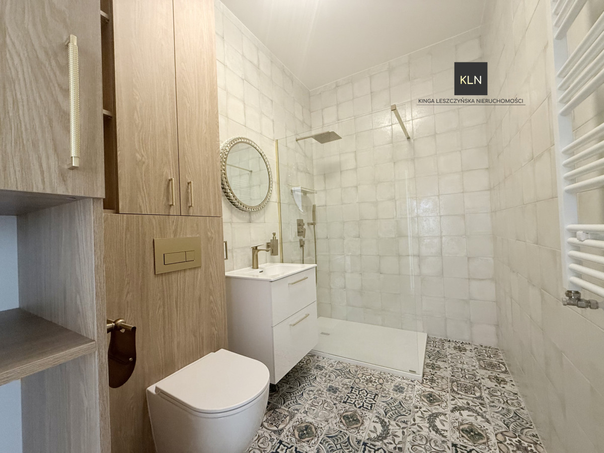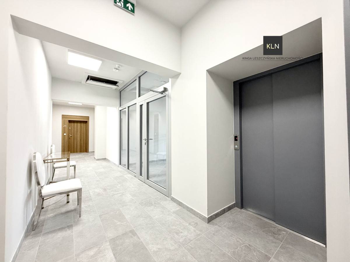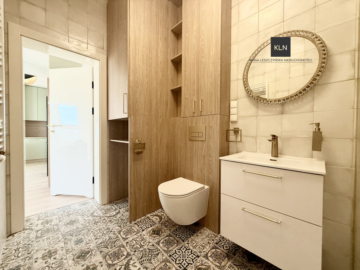 Mieszkanie wykończone jest pod klucz z wysokiej jakości materiałów, tj. zabudowa kuchenna wraz ze sprzętem AGD, płytki hiszpańskie, armatura i oświetlenie sprowadzane z zagranicy, panele wysokiej klasy.